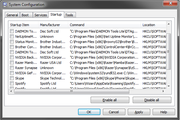 Once you’ve got the system configuration window open, you’ll want to click on the “Startup” tab. This is where you’ll see a list of all the programs that can start up when Windows initially boots. I’m guessing in your case, however, there are a lot more checked boxes. In my experience it is best to disable every program by pressing “Disable all” and then enable the individual ones you want to open on boot.